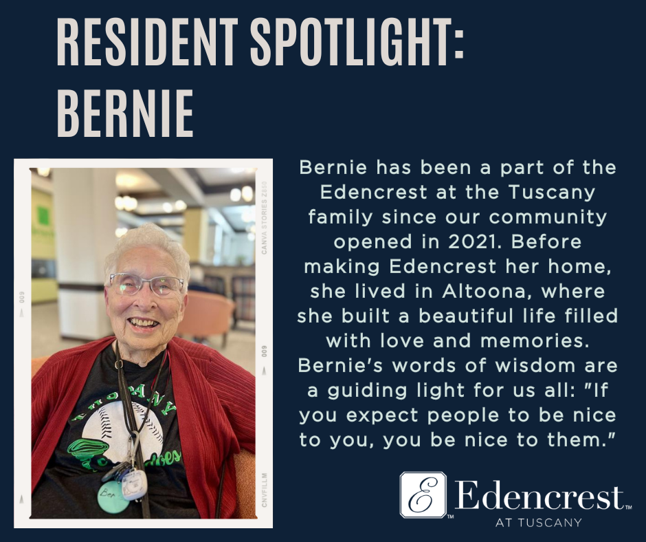 The Tuscany: Meet Bernie! Bernie has been a part of the Edencrest at the Tuscany family since our community opened in 2021. Before making Edencrest her home, she lived in Altoona, where she built a beautiful life filled with love and memories. Bernie’s words of wisdom are a guiding light for us all: “If you expect people to be nice to you, you be nice to them.”