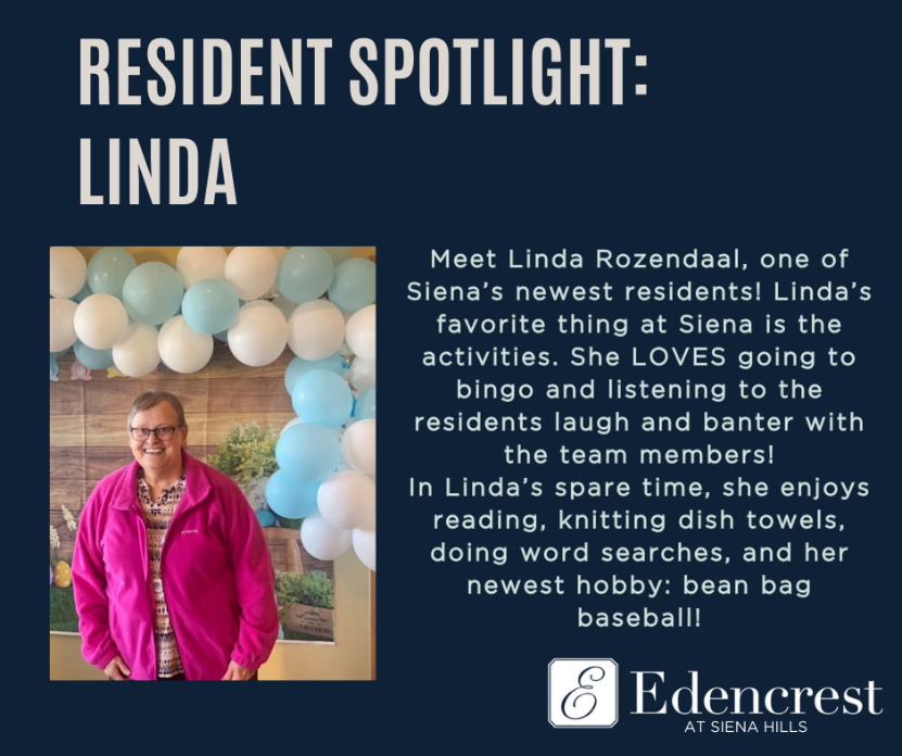 Siena Hills: Meet Linda Rozendaal! Linda’s favorite thing at Siena is the activities. She LOVES going to bingo and listening to the residents laugh and banter with the team members! In Linda’s spare time, she enjoys reading, knitting dish towels, doing word searches, and her newest hobby: bean bag baseball!