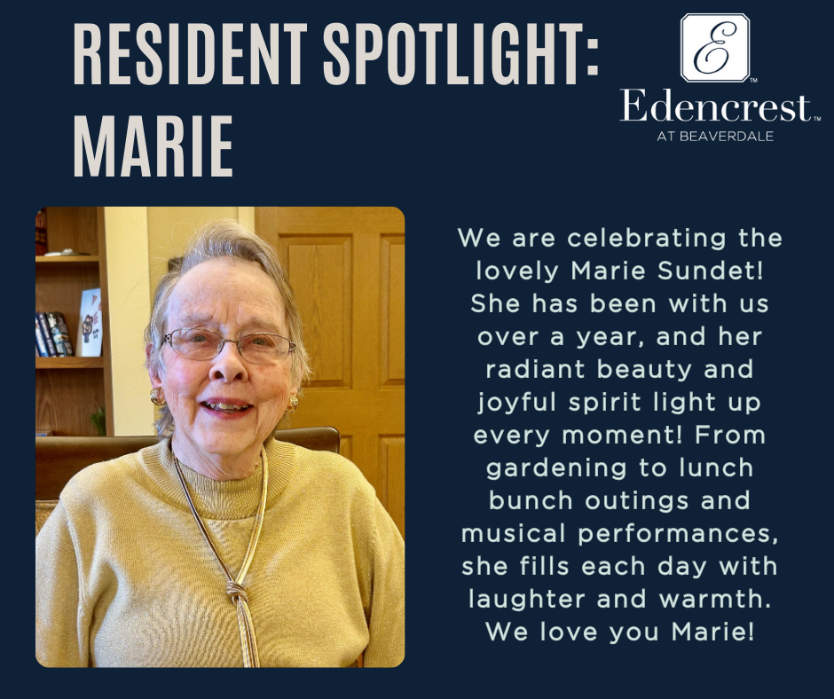 Beaverdale: Meet Marie! We are celebrating the lovely Marie Sundet! She has been with us over a year, and her radiant beauty and joyful spirit light up every moment! From gardening to lunch bunch outings and musical performances, she fills each day with laughter and warmth. We love you Marie!
