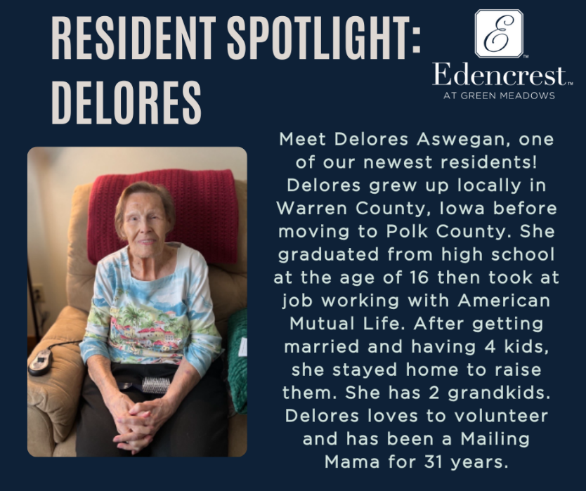 Green Meadows: Meet Delores Aswegan! Delores grew up locally in Warren County, Iowa before moving to Polk County. She graduated from high school at the age of 16 then took at job working with American Mutual Life. After getting married and having 4 kids, she stayed home to raise them. She has 2 grandkids. Delores loves to volunteer and has been a Mailing Mama for 31 years.