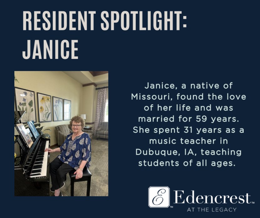 The Legacy: Meet Janice! Janice, a native of Missouri, found the love of her life and was married for 59 years. She spent 31 years as a music teacher in Dubuque, IA, teaching students of all ages. She loves to play the piano for our residents and enjoys when they come and sing along with her.