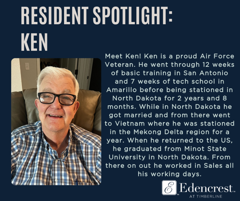 Timberline: Meet Ken! Ken is a proud Air Force Veteran. He went through 12 weeks of basic training in San Antonio and 7 weeks of tech school in Amarillo before being stationed in North Dakota for 2 years and 8 months. While in North Dakota he got married and from there went to Vietnam where he was stationed in the Mekong Delta region for a year. When he returned to the US, he graduated from Minot State University in North Dakota. From there on out he worked in Sales all his working days.