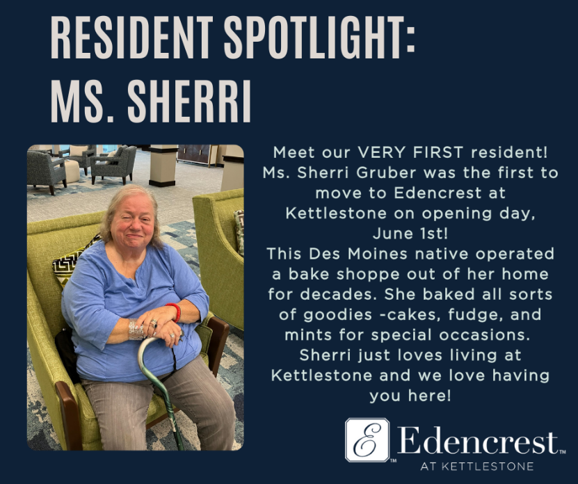 Kettlestone: Meet our VERY FIRST resident! Ms. Sherri Gruber was the first to move to Edencrest at Kettlestone on opening day, June 1st! This Des Moines native operated a bake shoppe out of her home for decades. She baked all sorts of goodies -cakes, fudge, and mints for special occasions. Sherri just loves living at Kettlestone and we love having you here!
